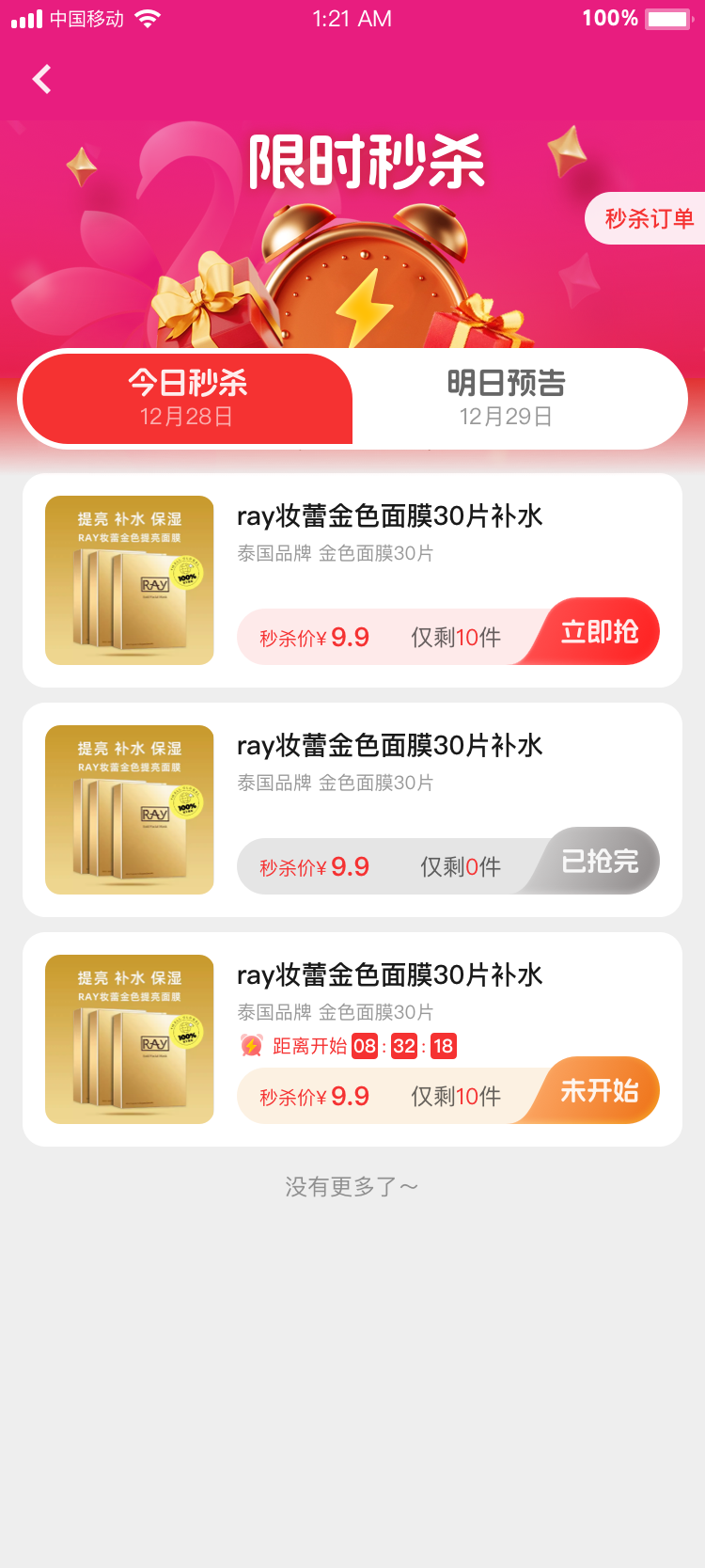 1.支持设定每日秒杀商品,用户不仅可参与今日秒杀,还能查看明日秒杀商品;